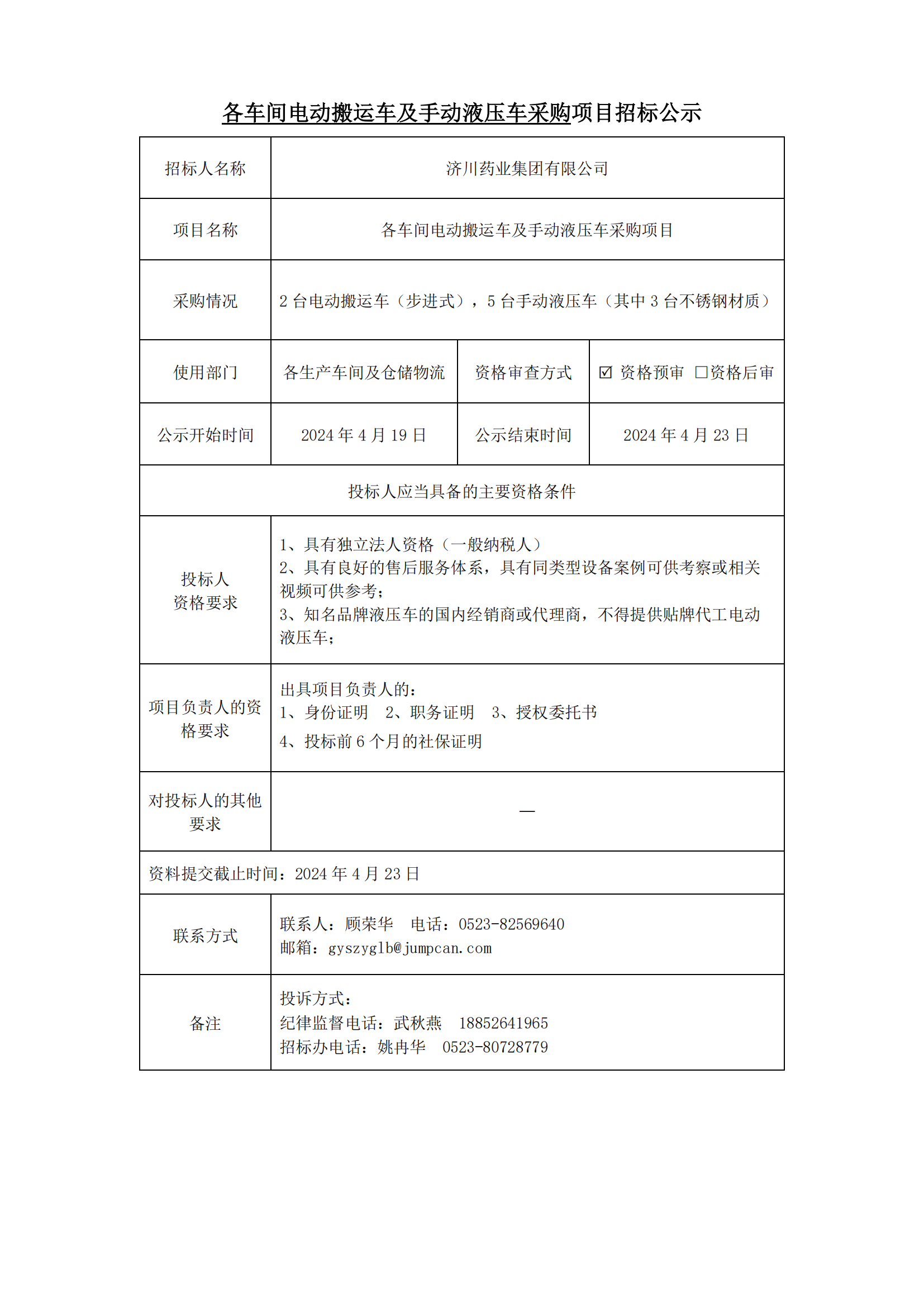 各车间电动搬运车及手动液压车采购项目招标公示