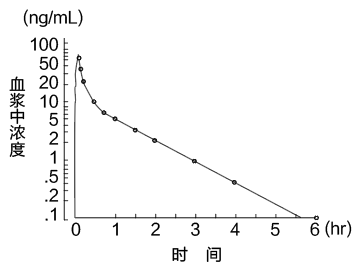 健康成人男性单次静脉注射盐酸奥普力农(相当于奥普力农10μg/kg)的血药浓度变化。(数值为4名平均值)